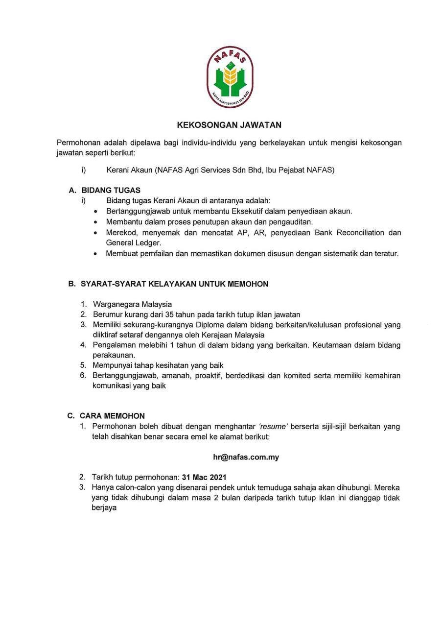 Kerja tetap dengan pelbagai faedah Mempunyai kenderaan sendiri Sila telefon atau WhatsApp resume anda kepada nombor di bawah untuk urusan temuduga- Cik Nur. Di sesetengah syarikat kedudukan pembantu perakaunan mungkin mempunyai pelbagai tahap. - mempunyai pengalaman sekurangnya setahun sebagai kerani akaun dan.